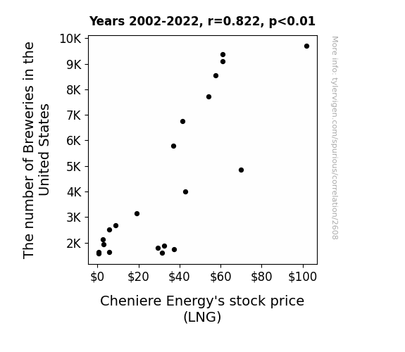 In conclusion, our results not only highlight the unexpectedly strong correlation between the number of breweries in the United States and Cheniere Energy's stock price but also inspire us to consider the potential broader implications and market trends stemming from this unique relationship. It's a malt-ter of finance that compels us to scratch beneath the frothy surface and unearth the bubbling connections that pervade the financial ecosystem. Cheers to the revelations that emerge from the blending of seemingly unrelated industries, and may this research serve as a reminder that in the world of economics, correlations can be as unassuming as a stealthy IPA sneaking up on you.