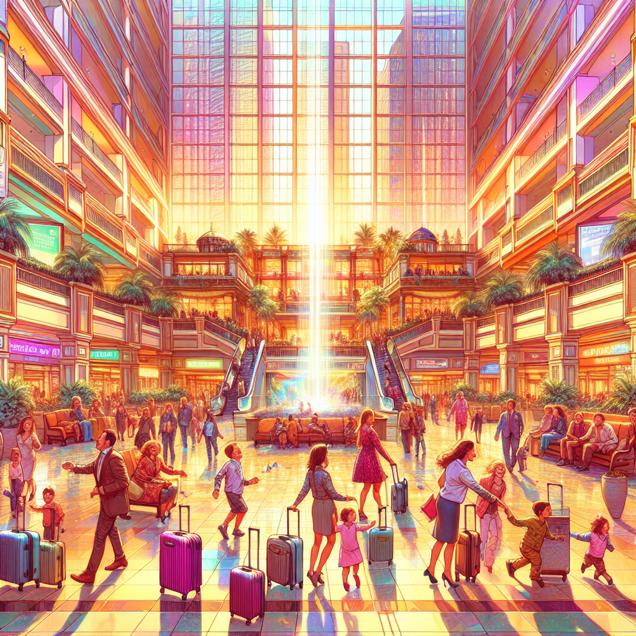 Prompt: [ Concept art ] I'd like to see an image of a vibrant hotel lobby bustling with families and suitcases. In the center, a digital ticker prominently displays the words "Marriott International (MAR) Stock Price Up," catching the eye of the passersby. Beyond the lobby, a cheerful playground and a park are filled with children laughing and playing under the sun. Some children answer to the name Denver, adding a personal touch to the lively scene. The depiction should include only scenes, people, and objects, it should not include text or speech bubbles.