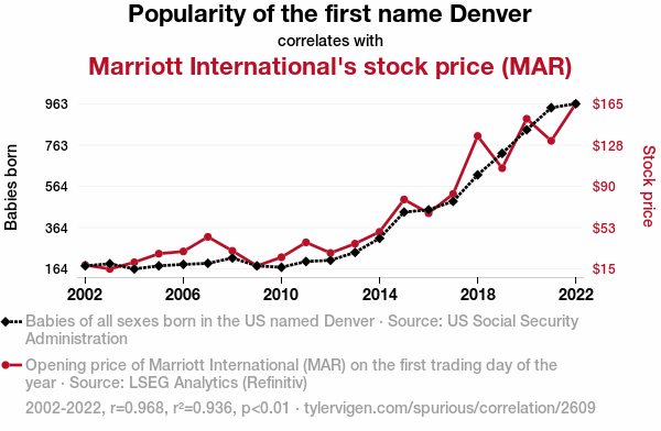 User prompt: Please provide potential search keywords for a paper titled Denver's Dominance: Delving into the Link Between the Name Denver and Marriott International's Market Movements with an abstract of This study investigates the peculiar correlation between the popularity of the first name "Denver" and the stock price of Marriott International (MAR). By analyzing data from the US Social Security Administration and LSEG Analytics (Refinitiv) over the period from 2002 to 2022, a remarkably high correlation coefficient of 0.9676094 and statistically significant p-value of less than 0.01 were observed. This unexpected connection prompts the question: could the name "Denver" hold the key to forecasting the movements of Marriott's stock price?