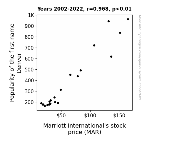 Thus, the unexpectedly strong correlation between the name "Denver" and Marriott International's stock price serves as a testament to the delightful surprises that can emerge from interdisciplinary analyses, and it beckons further exploration of the underlying mechanisms driving this connection. In a world where financial market analyses don't often invite levity, the emergence of this unique relationship adds a touch of unconventional delight and prompts mirthful ponderings about the curious ways in which names and stocks might intertwine.