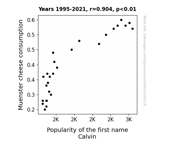This means 81.8% of the change in the one variable (i.e., Popularity of the first name Calvin) is predictable based on the change in the other (i.e., Muenster cheese consumption) over the 27 years from 1995 through 2021.
