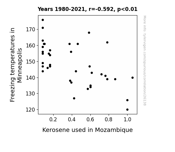 A linear line chart with years as the X-axis and two variables on the Y-axis. The first variable is Freezing temperatures in Minneapolis and the second variable is Kerosene used in Mozambique.  The chart goes from 1980 to 2021, and the two variables track closely in value over that time. Small Image