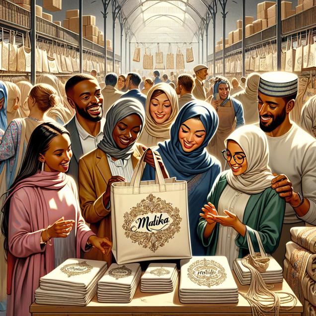 ChatGPT: In a bustling Macy's department store, a bright display catches everyone's attention. A personalized tote bag with the name "Malika" printed in elegant script draws shoppers in. Nearby, a group of smiling customers eagerly inspect the high-quality fabric and express their satisfaction with the product, visibly delighted with their purchase.