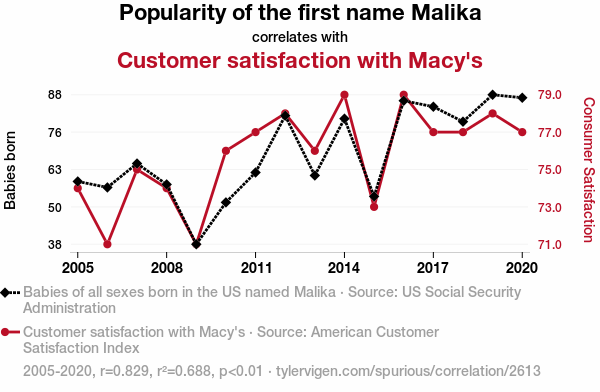 This means 68.8% of the change in the one variable (i.e., Customer satisfaction with Macy's) is predictable based on the change in the other (i.e., Popularity of the first name Malika) over the 16 years from 2005 through 2020.