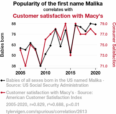 User prompt: Please make up a funny explanation for how an increase in Popularity of the first name Malika caused Customer satisfaction with Macy's to increase.