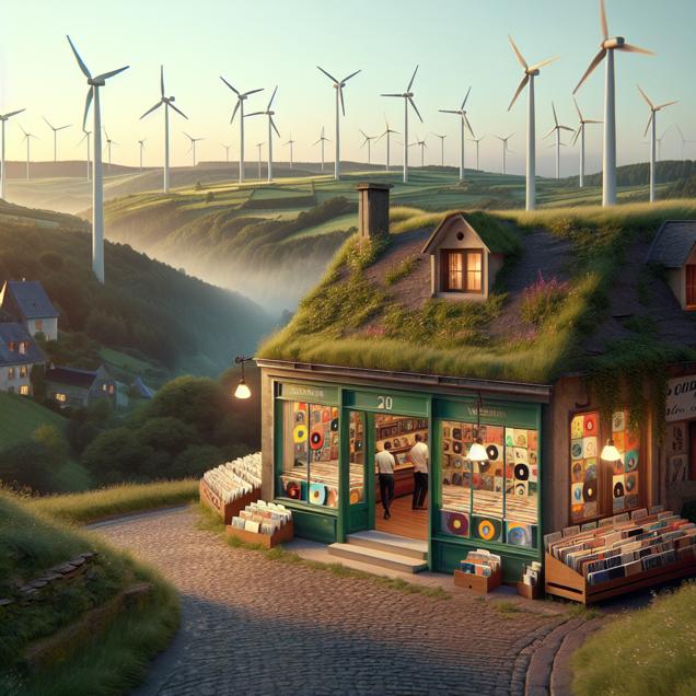 Prompt: [A photo-realistic image] of a picturesque landscape in Luxembourg, with rolling hills and lush greenery, dominated by a cluster of colorful wind turbines in the distance. The turbines are artfully set amidst the natural beauty, their blades gracefully spinning in the powerful gusts that sweep across the landscape. In the foreground, a charming music shop adorned with vibrant window displays stands out. The shop showcases a collection of vintage LP albums, with creatively arranged stacks catching the eye of passersby. Through the shop's open door, customers can be seen browsing through the vinyl records, surrounded by the warm and nostalgic glow of antique lighting. The image captures the harmonious coexistence of renewable energy and classic vinyl, with the dynamic wind turbines symbolizing progress and the music shop exuding a sense of timeless charm. The depiction should include only scenes, people, and objects, it should not include text or speech bubbles.