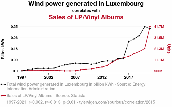 This means 81.3% of the change in the one variable (i.e., Sales of LP/Vinyl Albums) is predictable based on the change in the other (i.e., Wind power generated in Luxembourg) over the 25 years from 1997 through 2021.