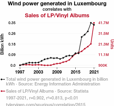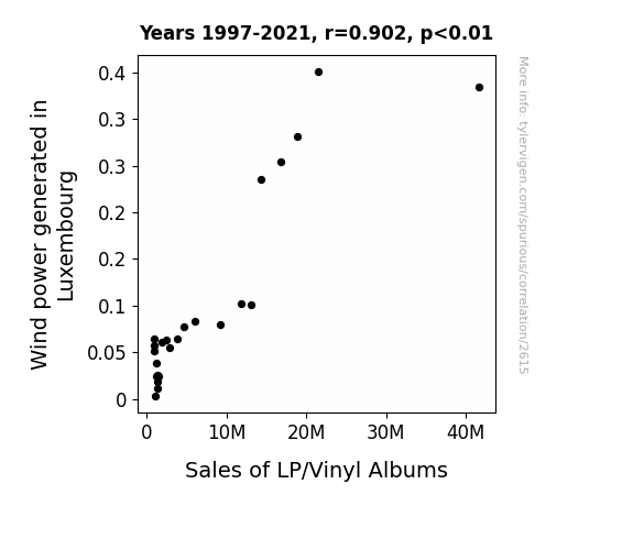 wind power generation, Luxembourg, LP sales, vinyl albums, renewable energy, analog music consumption, correlation coefficient, energy consumption, vintage music preferences, renewable energy influence, wind power impact, energy generation data