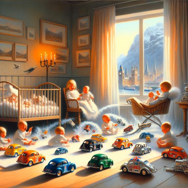 User prompt: Please respond with an image generation prompt that would be likely to create an interesting visual using DALLE-3, using the following style: [ An image that looks like it is a scene from a Pixar movie ] and depicting this scene: In a nursery in Norway, miniature toy cars are flying off the shelves as babies named London play with them. The room is filled with the sounds of little engines revving up, and the air smells faintly of gasoline. The popularity of the name London has sparked a surge in demand for these toys, leading to an increase in the production and consumption of fossil fuels. Keep the visual depiction simple. Do not include any words or speech bubbles.