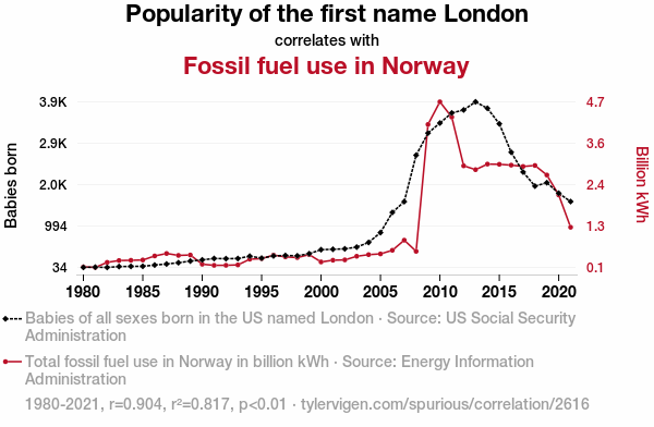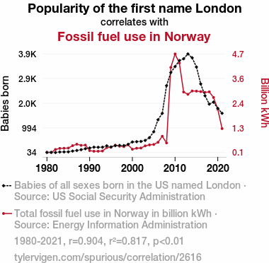 This means 81.7% of the change in the one variable (i.e., Fossil fuel use in Norway) is predictable based on the change in the other (i.e., Popularity of the first name London) over the 42 years from 1980 through 2021.