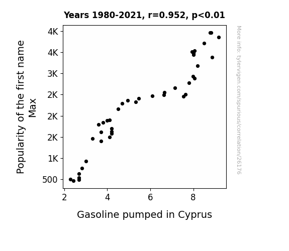 This means 90.6% of the change in the one variable (i.e., Gasoline pumped in Cyprus) is predictable based on the change in the other (i.e., Popularity of the first name Max) over the 42 years from 1980 through 2021.