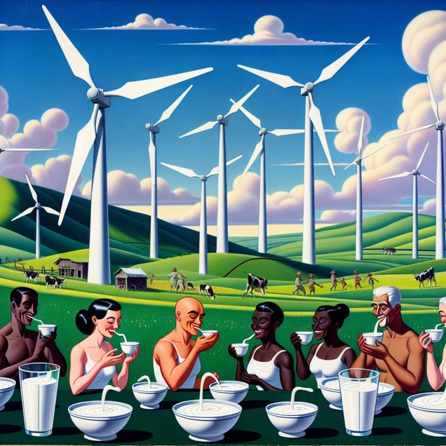ChatGPT: An image that looks like it is a scene from a Pixar movie: In a picturesque field in New Caledonia, rows of sleek wind turbines stand tall, their smooth blades turning gracefully in the breeze. Nearby, people enjoy cups of creamy yogurt, their contented smiles framed by a sunny blue sky. As they savor their snacks, the bacteria in the yogurt go to work, increasing methane production in their digestive systems. This methane is then harnessed to power the turbines, creating a gassy cycle of renewable energy that keeps the turbines spinning and the yogurt enthusiasts happy. Enhanced Description: In an animated scene, set against a backdrop of rolling green hills, pristine white wind turbines stand tall with their blades moving smoothly in the gentle breeze. The vibrant blue sky is dotted with fluffy clouds, adding to the picturesque landscape. In the foreground, a group of cheerful, stylized characters are seen enjoying cups of creamy yogurt, their smiling faces exuding contentment as they soak in the pleasant atmosphere. A whimsical visual representation of the methane production process in their bodies is illustrated, conveying a dynamic and entertaining portrayal of the renewable energy cycle.