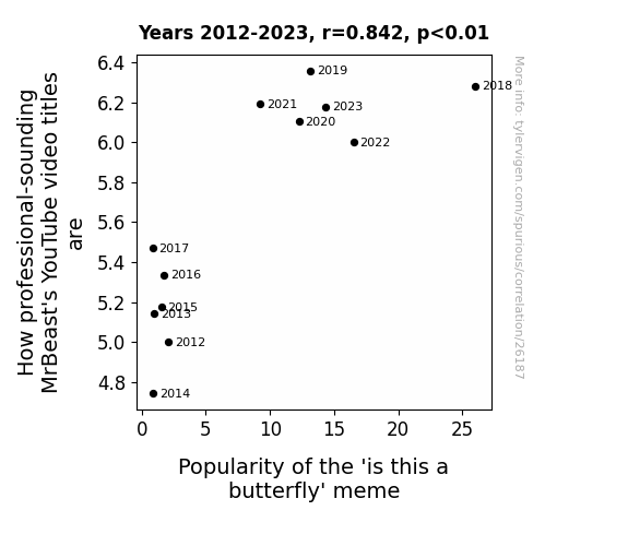 This means 70.9% of the change in the one variable (i.e., Popularity of the 'is this a butterfly' meme) is predictable based on the change in the other (i.e., How professional-sounding MrBeast's YouTube video titles are) over the 12 years from 2012 through 2023.