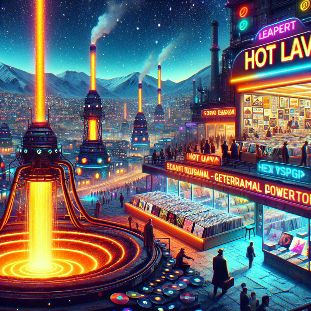 ChatGPT: Generate an image of a futuristic cityscape in Turkiye, featuring geothermal power plants in the foreground, emitting a vibrant glow as they harness the Earth's natural heat. In the distance, a bustling record store draws in customers who are flipping through rows of LPs and vinyl albums under the neon glow of "hot lava" music releases. The city is alive with activity, and the rhythmic hum of the geothermal power plants seems to harmonize with the underground beats of the music, creating a unique fusion of Earth's energy and the resurgence of analog music.