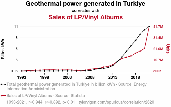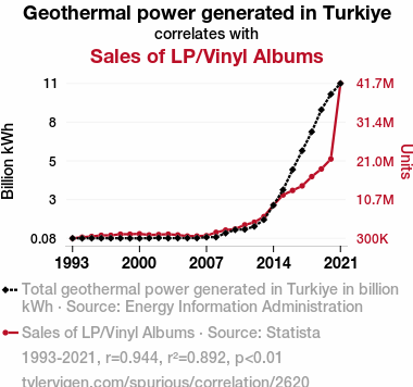 This means 89.2% of the change in the one variable (i.e., Sales of LP/Vinyl Albums) is predictable based on the change in the other (i.e., Geothermal power generated in Turkiye) over the 29 years from 1993 through 2021.