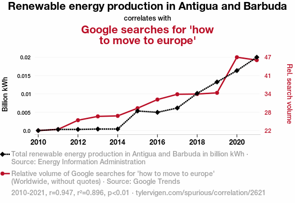 User prompt: Please make up a funny explanation for how an increase in Renewable energy production in Antigua and Barbuda caused how to move to europe (Google searches for 'how to move to europe') to increase.