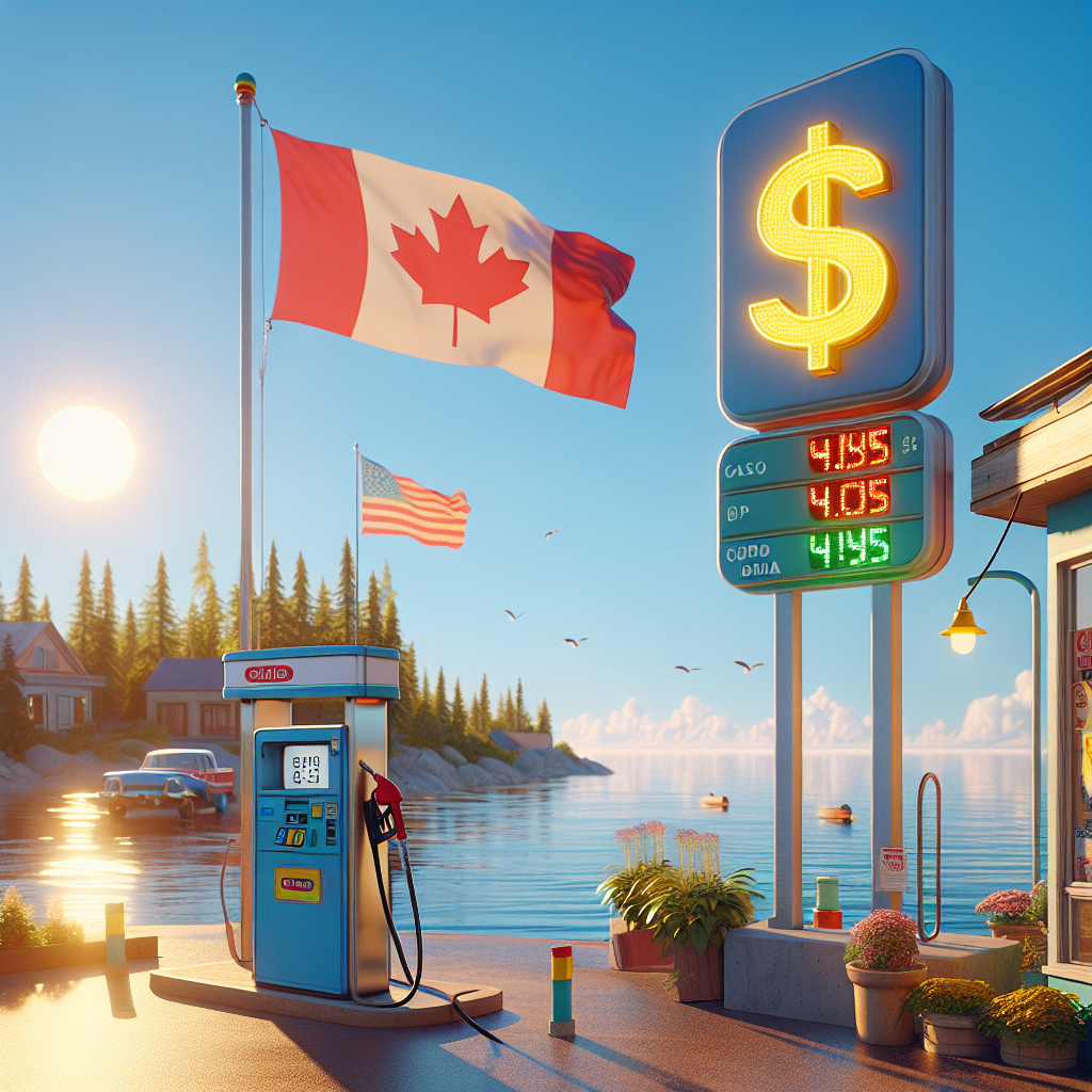 Prompt: [ A photo-realistic image ] Depict a tranquil, sunlit setting with a clear blue sky. In the background, a maple leaf flag of Canada waves gently in the breeze. In the foreground, a gas pump stands prominently, and its price sign displays the cost of gasoline in US dollars. Nearby, a storefront showcases a glowing Canadian dollar symbol, symbolizing the GDP per capita in Canada. The depiction should include only scenes, people, and objects, it should not include text or speech bubbles.