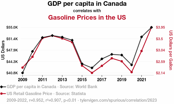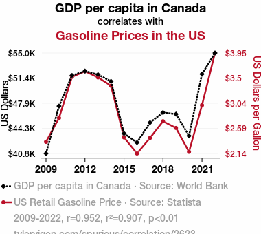 Canadian GDP per capita, US gasoline prices, economic correlation, cross-border economic dynamics, GDP per capita Canada, gasoline prices United States, World Bank data, Statista data, statistical analysis, correlation coefficient, economic relationship, fuel costs, economic prosperity