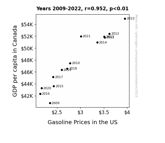 This means 90.7% of the change in the one variable (i.e., Gasoline Prices in the US) is predictable based on the change in the other (i.e., GDP per capita in Canada) over the 14 years from 2009 through 2022.