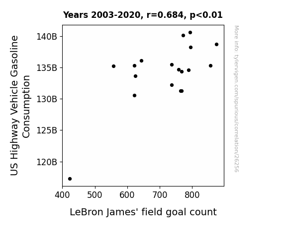 This means 46.8% of the change in the one variable (i.e., LeBron James' field goal count) is predictable based on the change in the other (i.e., US Highway Vehicle Gasoline Consumption) over the 18 years from 2003 through 2020.
