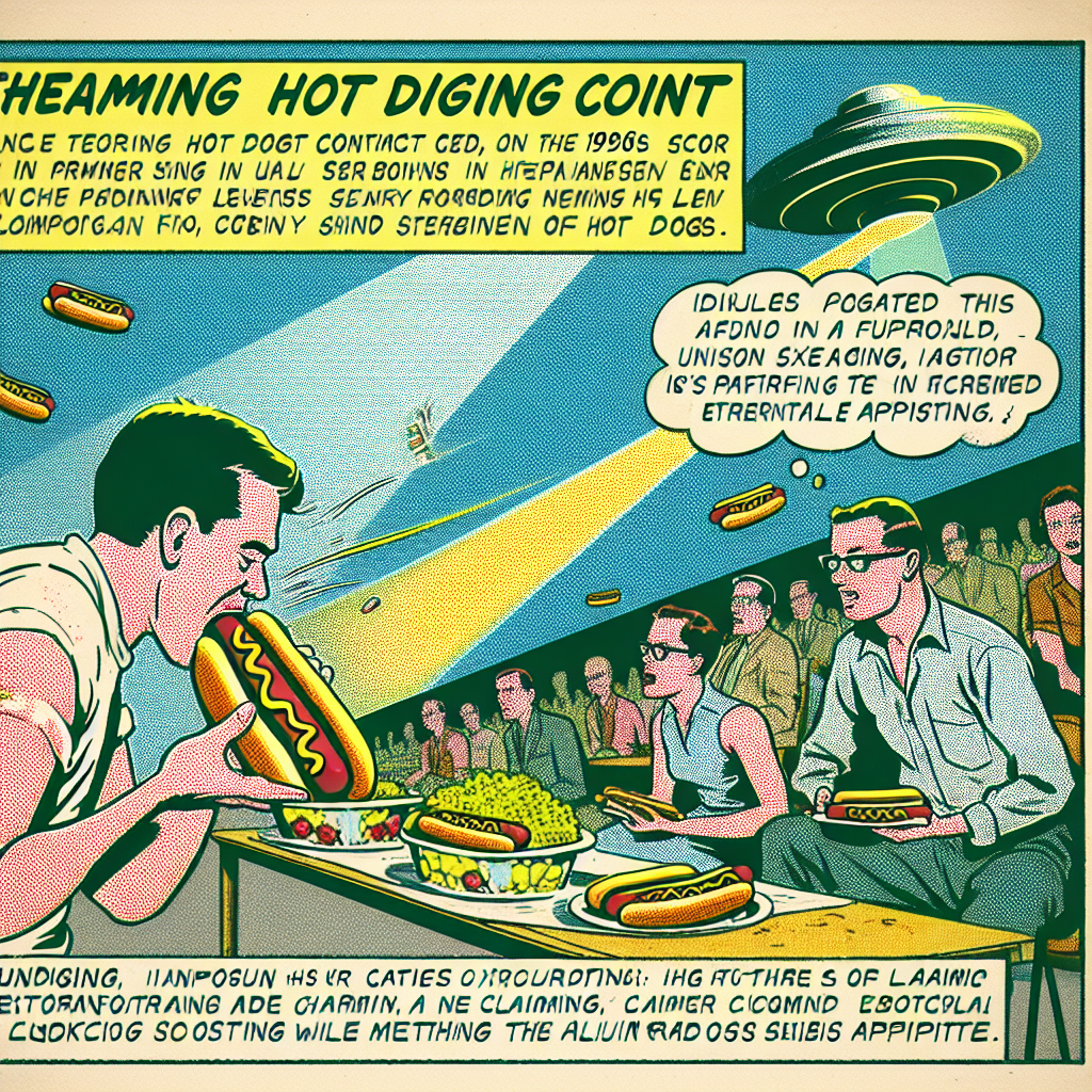 ChatGPT: Generate a scene of a comic-book-style illustration set in the 1960s, using muted colors and a dotted halftone pattern. Depict a bustling Nathan's Hot Dog Eating Competition in Indiana, with a radiant UFO hovering overhead, causing a surge in reported sightings. The reigning champion, fueled by the special radiation, eagerly devours an extraordinary number of hot dogs. The crowd watches in wonder as the glowing UFO and the hearty consumption of hot dogs seem to create an unseen bond, warding off any alien influence while satisfying the champion's craving.