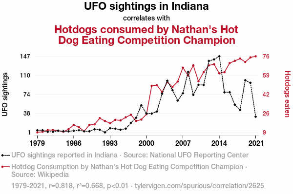 A linear line chart with years as the X-axis and two variables on the Y-axis. The first variable is UFO sightings in Indiana and the second variable is Hotdogs consumed by Nathan's Hot Dog Eating Competition Champion.  The chart goes from 1979 to 2021, and the two variables track closely in value over that time. Small Image