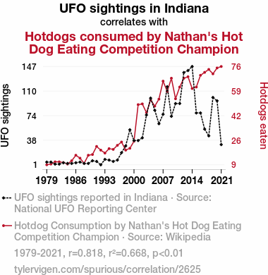 (Fig. 1) displays a scatterplot illustrating the substantial positive correlation between the number of UFO sightings in Indiana and the volume of hotdogs consumed by the renowned winners of Nathan's Hot Dog Eating Competition.