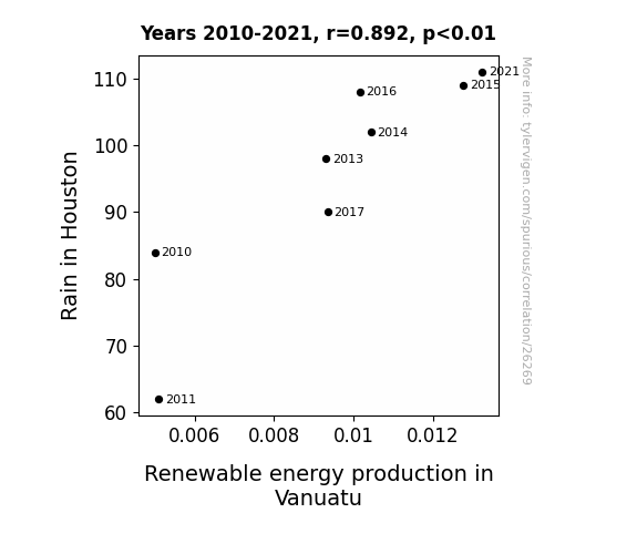 This means 79.6% of the change in the one variable (i.e., Renewable energy production in Vanuatu) is predictable based on the change in the other (i.e., Rain in Houston) over the 8 years from 2010 through 2021.