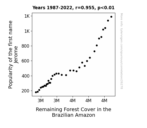 This means 91.3% of the change in the one variable (i.e., Remaining Forest Cover in the Brazilian Amazon) is predictable based on the change in the other (i.e., Popularity of the first name Jerome) over the 36 years from 1987 through 2022.