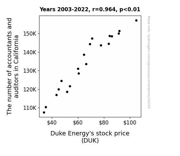 This means 93% of the change in the one variable (i.e., Duke Energy's stock price (DUK)) is predictable based on the change in the other (i.e., The number of accountants and auditors in California) over the 20 years from 2003 through 2022.