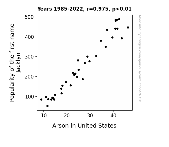 This means 95.1% of the change in the one variable (i.e., Arson in United States) is predictable based on the change in the other (i.e., Popularity of the first name Jacklyn) over the 38 years from 1985 through 2022.