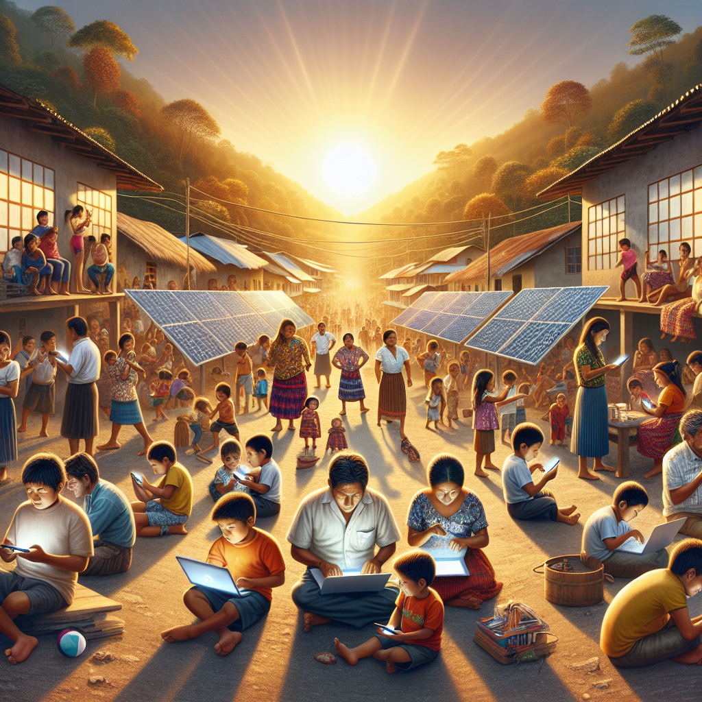 ChatGPT: Generate an image that portrays a vibrant Honduran village with families congregating around a communal solar panel. Show the families basking in the radiant glow of sunlight, with children engrossed in their smartphones and adults typing on laptops. Capture the essence of cyber folk intertwining with traditional village life in this sun-drenched setting. Emphasize the technological interconnectedness and sustainability provided by solar power. Aim to create a compelling visual that resonates with the convergence of modern technology and traditional community living.
