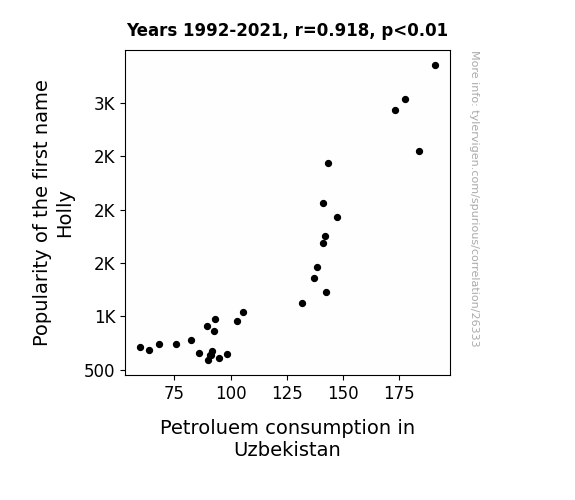 This means 84.3% of the change in the one variable (i.e., Petroluem consumption in Uzbekistan) is predictable based on the change in the other (i.e., Popularity of the first name Holly) over the 30 years from 1992 through 2021.