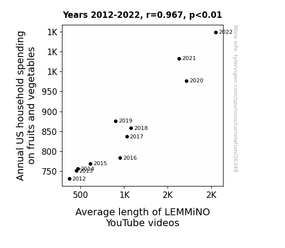 This means 93.5% of the change in the one variable (i.e., Average length of LEMMiNO YouTube videos) is predictable based on the change in the other (i.e., Annual US household spending on fruits and vegetables) over the 11 years from 2012 through 2022.