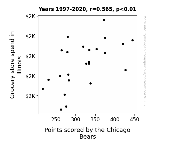 This means 32% of the change in the one variable (i.e., Points scored by the Chicago Bears) is predictable based on the change in the other (i.e., Grocery store spend in Illinois) over the 24 years from 1997 through 2020.