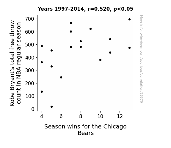 This means 27% of the change in the one variable (i.e., Season wins for the Chicago Bears) is predictable based on the change in the other (i.e., Kobe Bryant's total free throw count in NBA regular season) over the 18 years from 1997 through 2014.