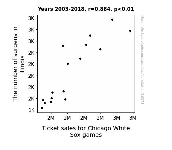 This means 78.2% of the change in the one variable (i.e., Ticket sales for Chicago White Sox games) is predictable based on the change in the other (i.e., The number of surgens in Illinois) over the 16 years from 2003 through 2018.