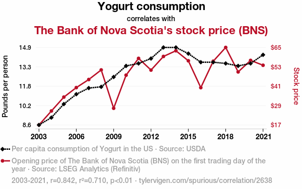 A linear line chart with years as the X-axis and two variables on the Y-axis. The first variable is Yogurt consumption and the second variable is The Bank of Nova Scotia's stock price (BNS).  The chart goes from 2003 to 2021, and the two variables track closely in value over that time. Small Image