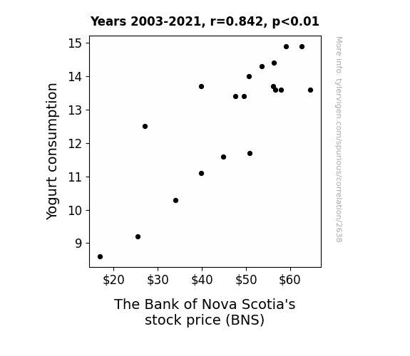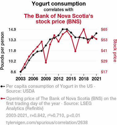 This means 71% of the change in the one variable (i.e., The Bank of Nova Scotia's stock price (BNS)) is predictable based on the change in the other (i.e., Yogurt consumption) over the 19 years from 2003 through 2021.
