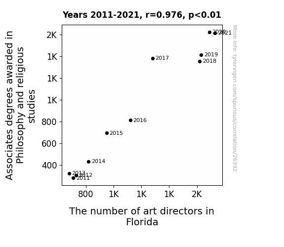 This means 95.2% of the change in the one variable (i.e., The number of art directors in Florida) is predictable based on the change in the other (i.e., Associates degrees awarded in Philosophy and religious studies) over the 11 years from 2011 through 2021.