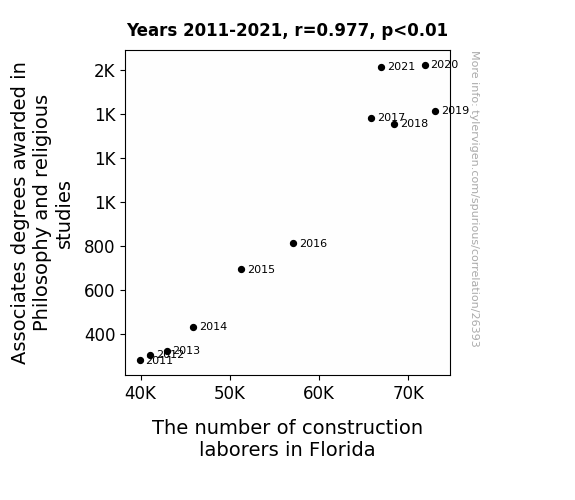 This means 95.4% of the change in the one variable (i.e., The number of construction laborers in Florida) is predictable based on the change in the other (i.e., Associates degrees awarded in Philosophy and religious studies) over the 11 years from 2011 through 2021.