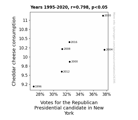 This means 63.6% of the change in the one variable (i.e., Votes for the Republican Presidential candidate in New York) is predictable based on the change in the other (i.e., Cheddar cheese consumption) over the 7 years from 1995 through 2020.