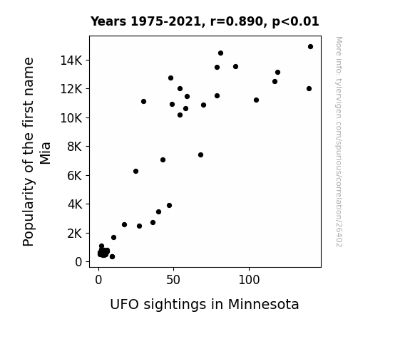 This means 79.2% of the change in the one variable (i.e., UFO sightings in Minnesota) is predictable based on the change in the other (i.e., Popularity of the first name Mia) over the 47 years from 1975 through 2021.