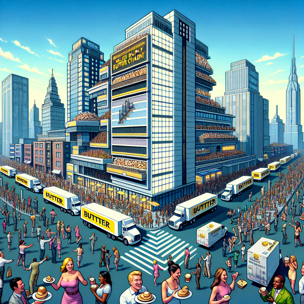 ChatGPT: Generate an image that portrays a bustling city skyline with a sleek Equinix building standing prominently. People are happily indulging in pastries and desserts near the building, while a steady stream of trucks labeled "Butter Supply Chain" are unloading butter crates into the facility. The Equinix building features a prominent sign that reads "Butter Vault," and the stock ticker prominently displays the rising stock price of Equinix. The scene should be vibrant, with a focus on the building, people, and the bustling city.