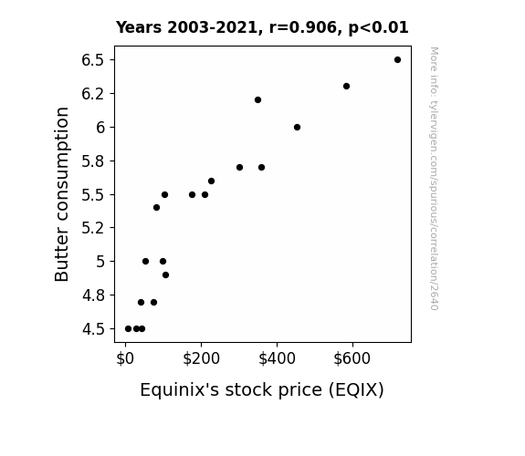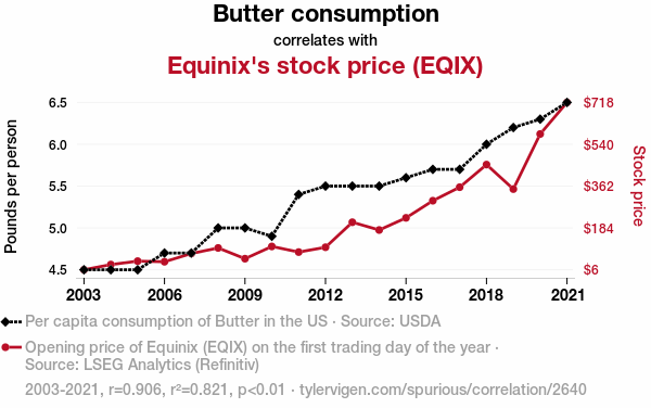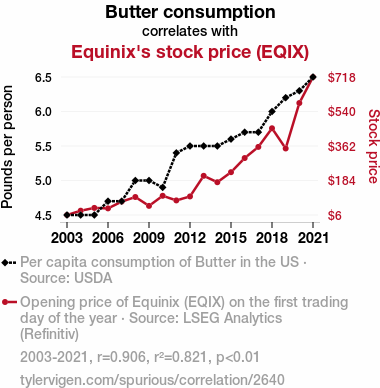 - The spurious research paper: Spreading the Wealth: A Butterly Connection between Butter Consumption and Equinix's Stock Price