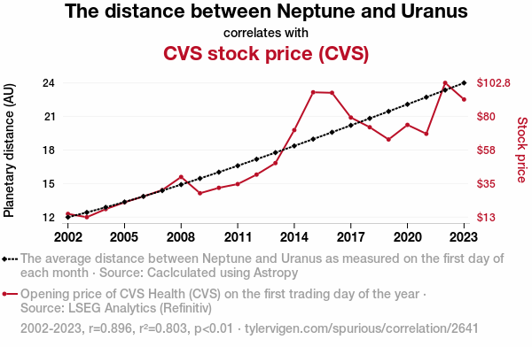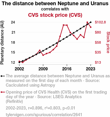 - The spurious research paper: The Cosmic Connection: Exploring the Correlation Between the Distance Between Neptune and Uranus and CVS Stock Price