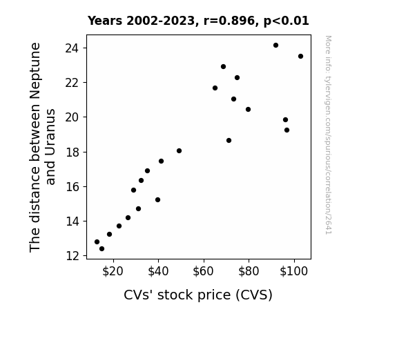 This means 80.3% of the change in the one variable (i.e., CVS stock price (CVS)) is predictable based on the change in the other (i.e., The distance between Neptune and Uranus) over the 22 years from 2002 through 2023.