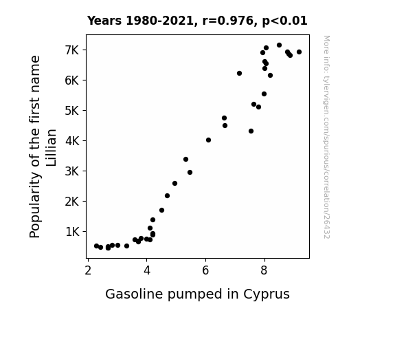 This means 95.3% of the change in the one variable (i.e., Gasoline pumped in Cyprus) is predictable based on the change in the other (i.e., Popularity of the first name Lillian) over the 42 years from 1980 through 2021.