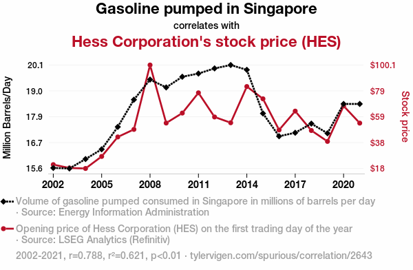 This means 62.1% of the change in the one variable (i.e., Hess Corporation's stock price (HES)) is predictable based on the change in the other (i.e., Gasoline pumped in Singapore) over the 20 years from 2002 through 2021.