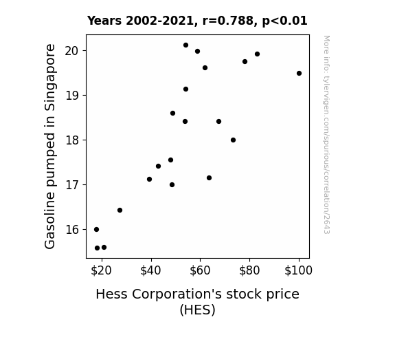 - The spurious research paper: Fuel for Thought: The Pumped-up Connection between Singapore Gasoline and Hess Corporation's Stock Price